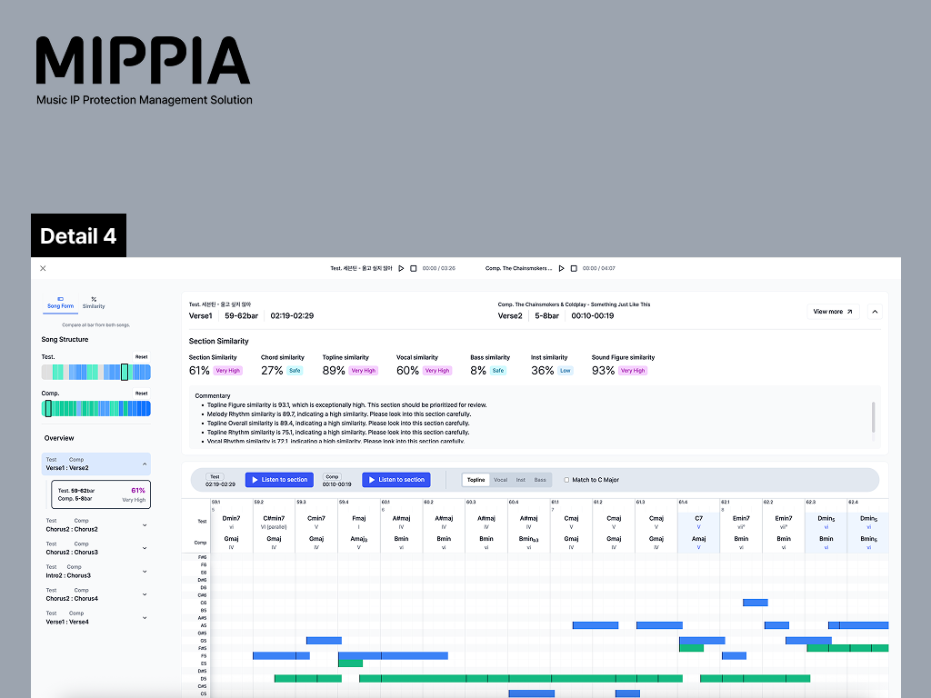 Its services include plagiarism detection, 1:1 similarity analysis, real-time global monitoring, and generative AI music detection. Trusted by 30,000 musicians in 149 countries, MIPPIA launched Korea’s first AI music detector with 98% accuracy. Backed by two Korean patents and one PCT international patent, MIPPIA partners with entertainment firms, distributors, and institutions to build a trusted global music IP ecosystem.