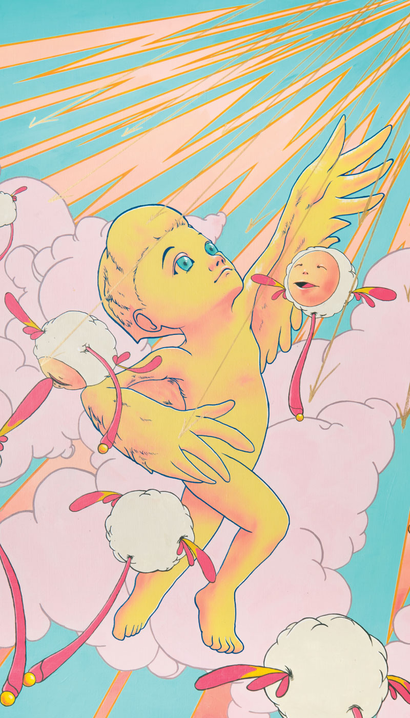 Kyeonghoon Oh, who was born in Gwangju, currently lives and works in Seoul. He obtained a degree in Media Art from Kaywon University of Art and Design. His practice blends Eastern traditions with Western sensibilities, utilizing a unique style that incorporates diluted acrylic paint, diffusion, and layering techniques. This approach embraces elements of Eastern aesthetics and color palettes, along with influences from Western mythology, legends, and animation-inspired imagery. Oh's thought-provoking work explores the aesthetic and sensory perceptual differences between Eastern and Western cultures, as well as his personal journey toward realizing dreams amid memories of frustration.